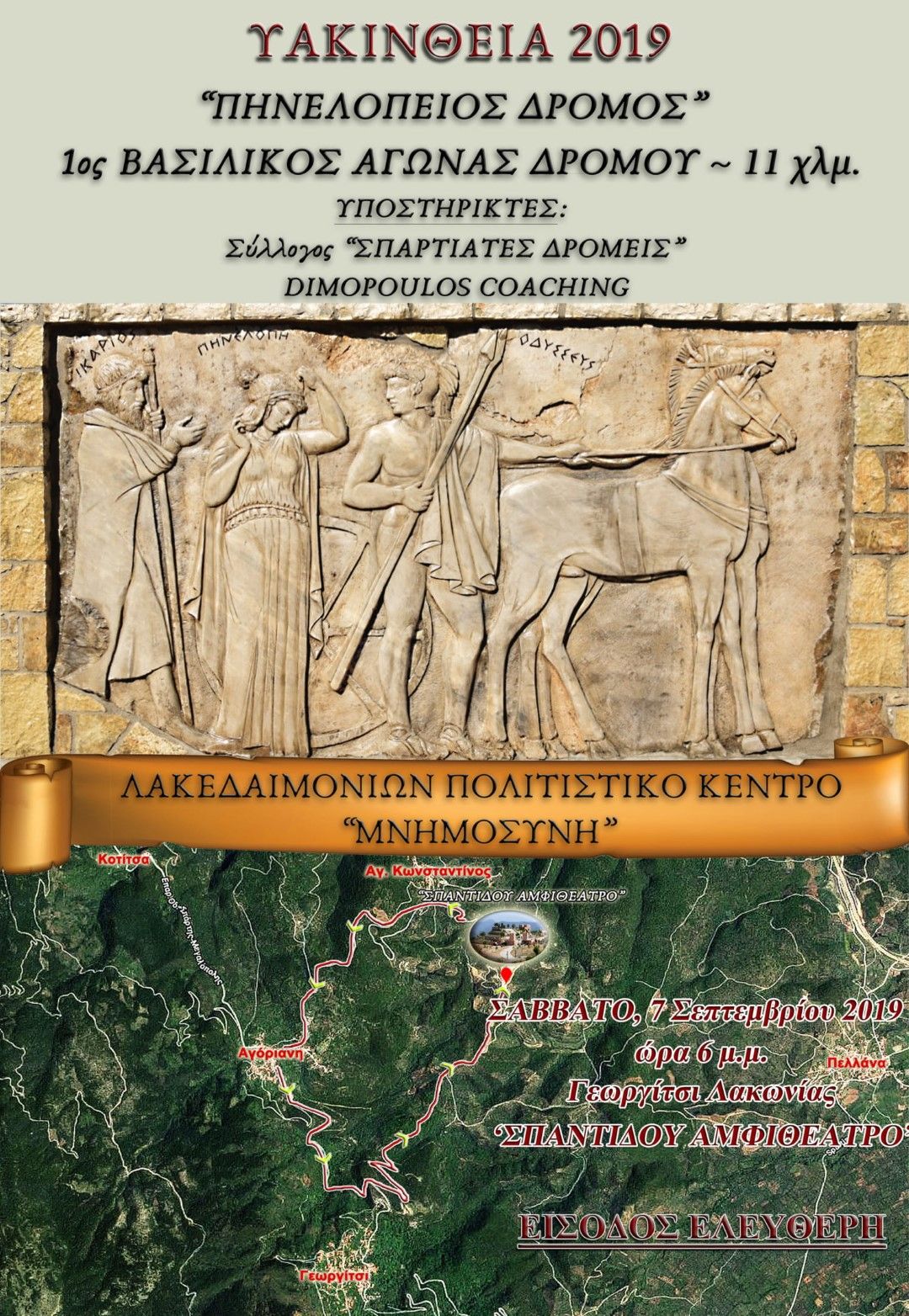 Tο ΛΑΚΕΔΑΙΜΟΝΙΩΝ ΠΟΛΙΤΙΣΤΙΚΟ ΚΕΝΤΡΟ ΄΄ΜΝΗΜΟΣΥΝΗ΄΄ με την υποστήριξη των Σπαρτιατών Δρομέων και του Dimopoulos coaching, μέσα στα πλαίσια των ΥΑΚΙΝΘΕΙΩΝ 2019, διοργανώνουν τον 1ο ΒΑΣΙΛΙΚΟ ΑΓΩΝΑ ΔΡΟΜΟΥ 11χλμ., με την ονομασία ΠΗΝΕΛΟΠΕΙΟΣ ΔΡΟΜΟΣ
